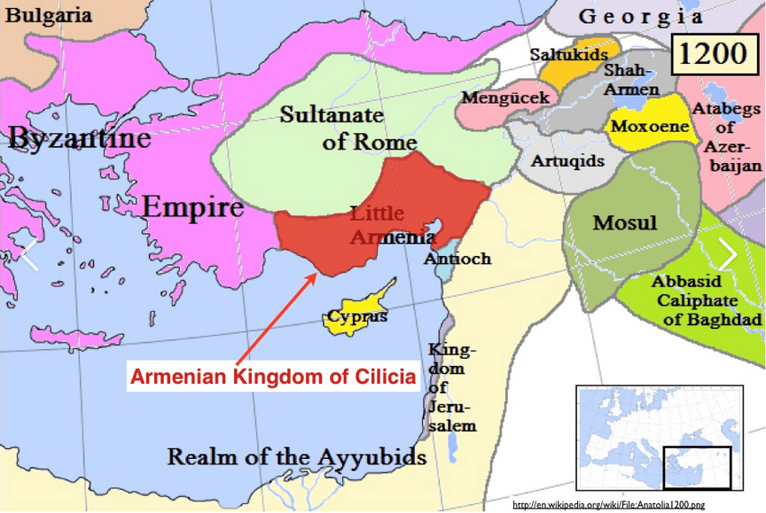 Here the Byzantine governor gave them shelter in the late 11th century. Two great dynastic families, the Rubenids and the Hethumids, ruled what became in 1199, with the coronation of Levon I, the Armenian Kingdom of Cilicia and through skillful diplomacy and military alliances (explained below) maintained their political autonomy until 1375.[67] The kingdom’s political independence relied on a vast network of castles which controlled the mountain passes and the strategic harbours.[68] Almost all of the civilian settlements were located directly below or near these fortifications.” The loss of control and destruction of traditional Armenian homelands was so complete, that “The Catholicosate [Patriarch, Pope, DB] of the Armenian Apostolic Church followed its people in taking refuge outside the Armenian highlands, which had turned into a battleground of Byzantine and Seljuk contenders. Its seat was first transferred to Sebasteia in 1058 in Cappadocia, where had existed a significant Armenian population. Later, it moved to various locations in Cilicia.”