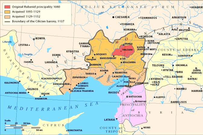 Wikipedia: “The Armenians in Cilicia gained powerful allies among the Frankish Crusaders, whose leader, Godfrey de Bouillon, was considered a savior for the Armenians. Constantine saw the Crusaders’ arrival as a one-time opportunity to consolidate his rule of Cilicia by eliminating the remaining Byzantine strongholds in the region.[16] With the Crusaders’ help, they secured Cilicia from the Byzantines and Turks, both by direct military actions in Cilicia and by establishing Crusader states in Antioch, Edessa, and Tripoli.[17] The Armenians also helped the Crusaders; as described by Pope Gregory XIII in his Ecclesia Romana: