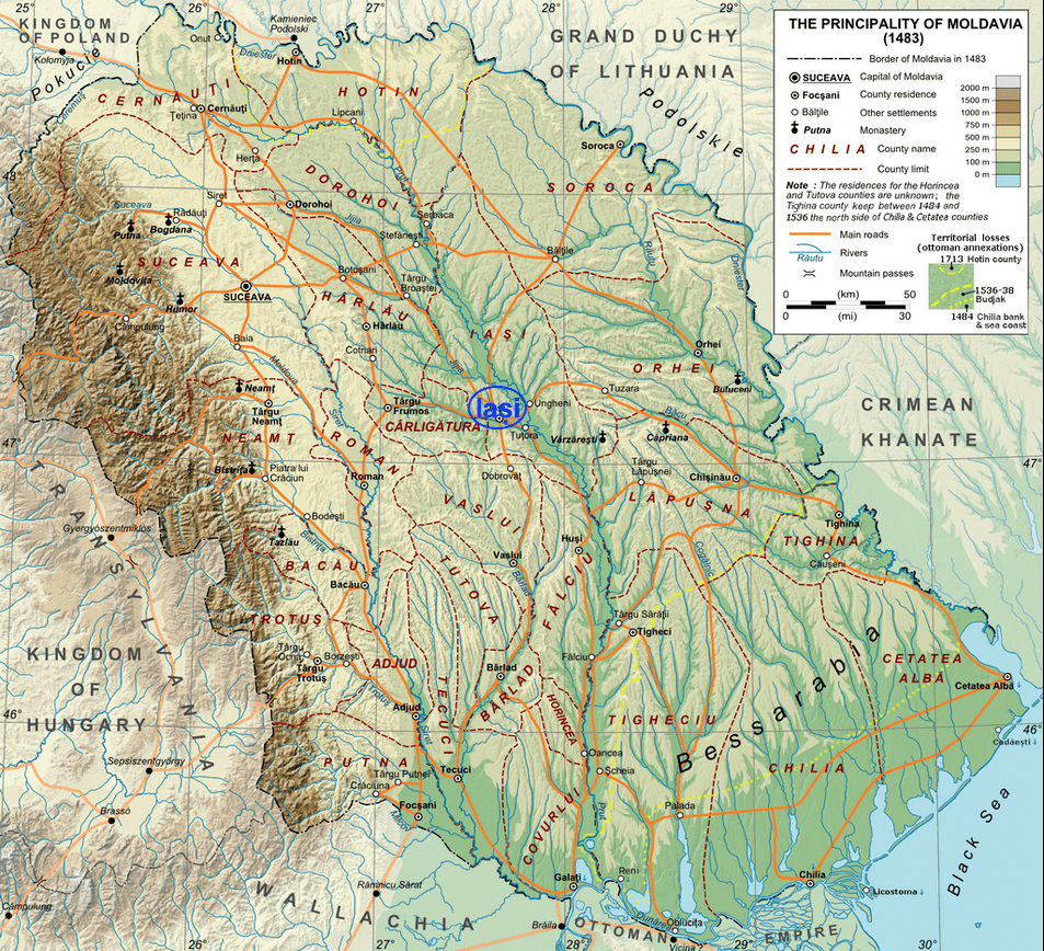 By 1483 the Principality of Moldavia had expanded east to the Dniester River and south to the Black Sea. Its capital was moved from Suceava to Iași (Jassy) in 1565.