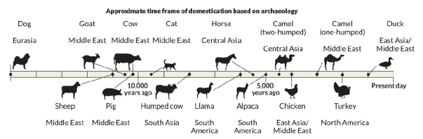 The ‘standard’ narrative of the ‘march of civilization’ says that it began with the development of farming, which coincided with the domestication of animals, such as dogs, sheep, goats, pigs, and cattle, and plants such as wheat, peas, olives, rice, bananas, sugar, millet, and sesame, which provided a stable source of food, making constant travel unnecessary. This led to the concept of real estate (private or corporate property with defined boundaries), which enabled irrigation, the building of cities, increased trade, and the development of states and empires.