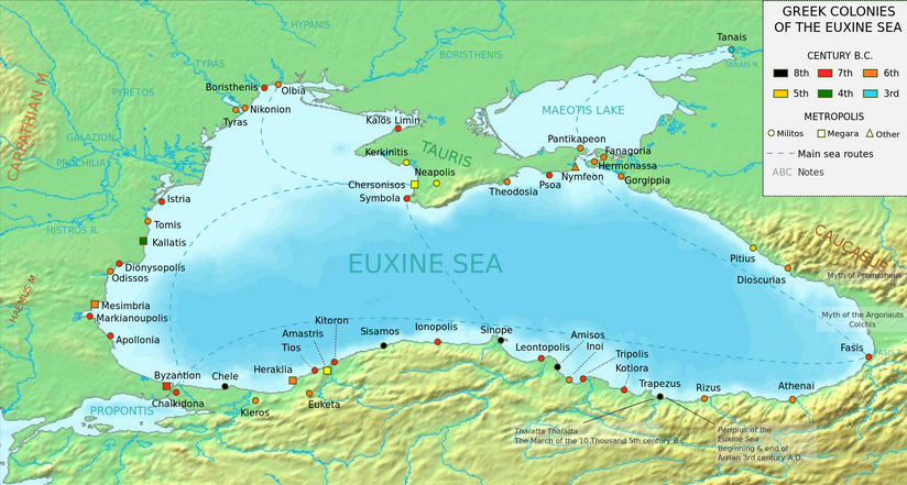 Their adventures at this time became the stuff of legend – Jason & the Argonauts searching Colchis (Georgia) for the Golden Fleece, Odysseus encountering the Cimmerians, Prometheus chained to a mountain in the Caucasus. They founded colonies designed to support the mother city that bankrolled ther expedition (mostly Megara and Miletus). Odessa, Trebizond, Byzantium, and Sinope started this way. Within 500 years Greeks had founded over 70 colonies, turning Pontos Euxeinos into a Greek lake.