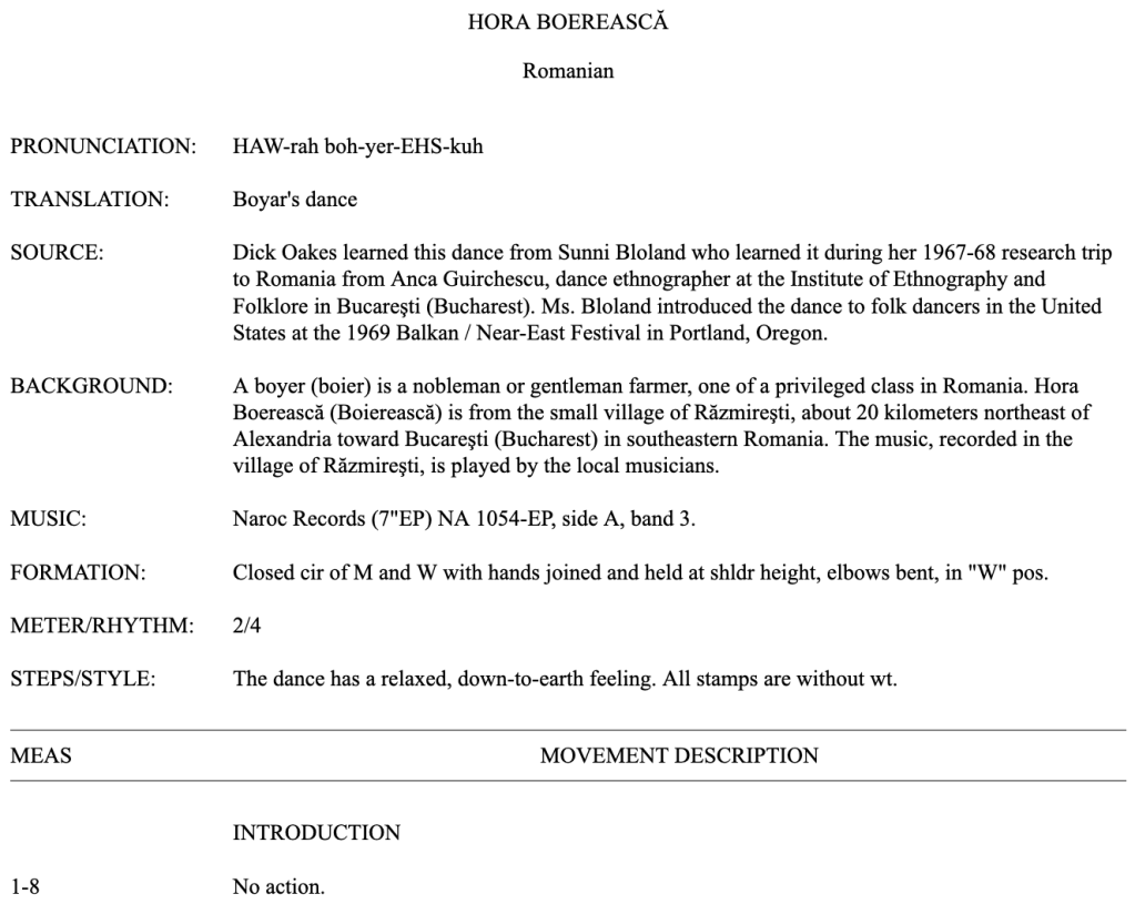 As for the “Dance of the Boyars”, it’s not a particular dance, but rather a dance type. Anca Giurchescu (with Sunni Bloland) in their encyclopedic volume Romanian Traditional Dance (out of print), classifies Boerească as a type of hora, the most widespread dance category throughout Romania. It can be either a hora în două părți (bi-directional), or polydirectional. Anca doesn’t specify, but all the boierească dances I have documented come from Oltenia or western Muntenia.