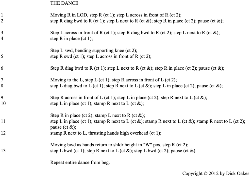 Going back to Dick Crum’s version, it is a circle dance and still uses the “slow, slow, quick, quick,slow” pattern, but is a lot more lively. Interestingly, he could not find music like what he heard in Romania, so he taught it to a Jewish Sher, a Klezmer form from Moldova. When he visited St. Louis, I played the dance and used a piece of Moldovan Romanian music and he approved.