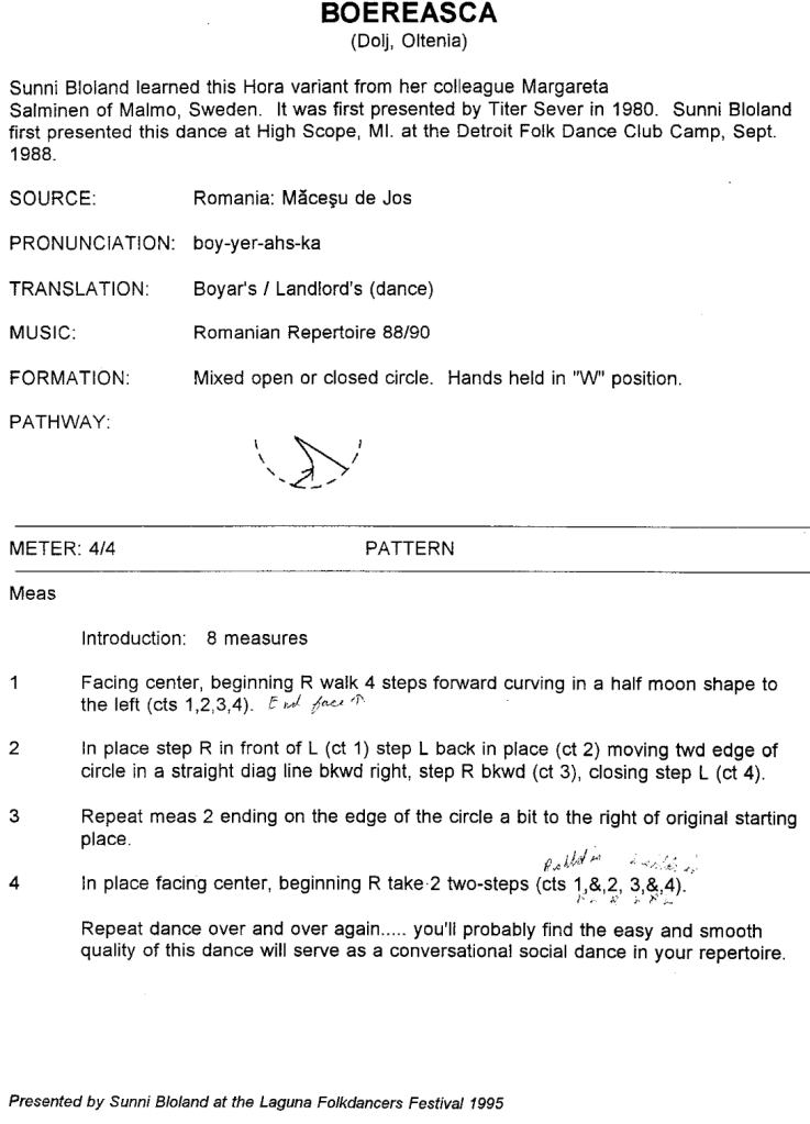 john.horo wrote: I was interested to see the versions of the dance taught later by Sunni Bloland and Alexandru David. Interestingly, there is yet and earlier form that Sunni taught back in the ’70s-’80s called “Boiereasca” . It is a “forward and back” one figure dance that I rather like better, and shares the same feel as the Alunelul Sucit she taught from the same record. The music is found on Nevofoon LP 15 005 (year not listed). I have the syllabus for that.