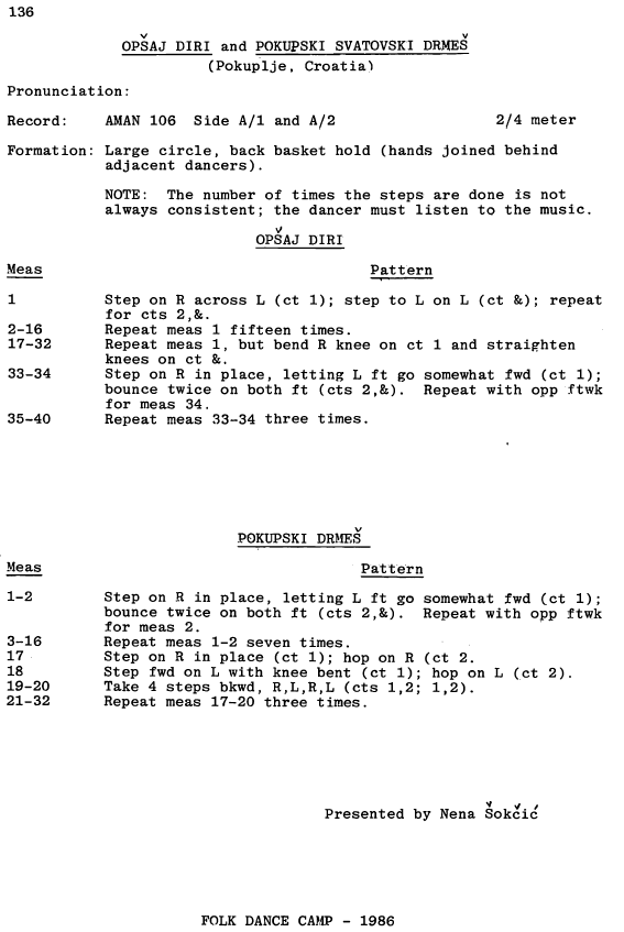 Ron lists four sets of lyrics, three of which are from liner notes to various recordings of Opšaj diri available in the USA. The lyrics below are from the Festival label AMAN 106 album, (taught by John Filcich & Nena Šokčić), which seems to be the most popular among recreational folk dancers.