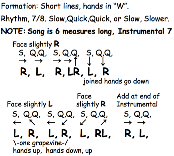 NOTE: The above notes outline a 7-measure dance. It also notes that the instrumental section is 7 measures long, while the singing is 6 measures long. On another page it says that that when dancing the vocal sections, the 7th measure should be omitted. The “original” dance was likely accompanied only by singing, so the first 6 measures are likely the “original” choreography. The 7th measure should be considered a “filler” to match the extra length of the instrumental.