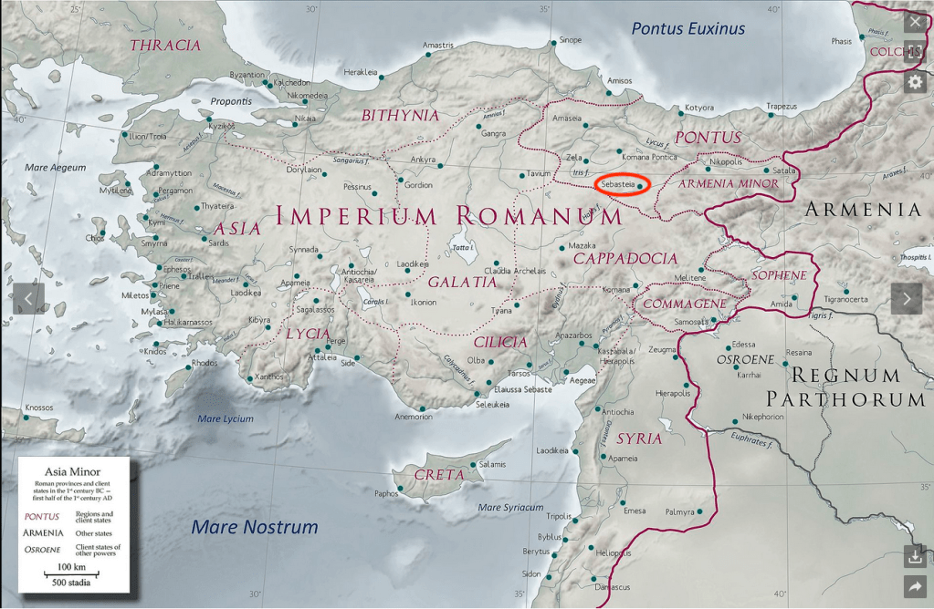 Anatolia in the early 1st century AD with Armenia Minor as a Roman client state. To sum up, though Armenians have lived in the area around and to the east of Sepastia for over 1000 years, they have usually been a minority, under another ruler – Persian, Roman, Greek, Turk, etc.