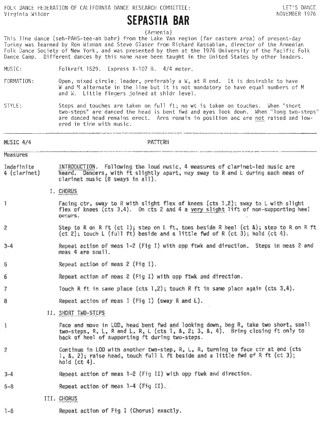 This line dance (seh-PAHS-tee-ah bahr) from the Lake Van region (far eastern area) of present-day Turkey was learned by Ron Wixman and Steve Glaser from Richard Kassabian, director of the Armenian Folk Dance Society of New York, and was presented by them at the 1976 University of the Pacific Folk Dance Camp. Different dances by this name have been taught in the United States by other leaders.