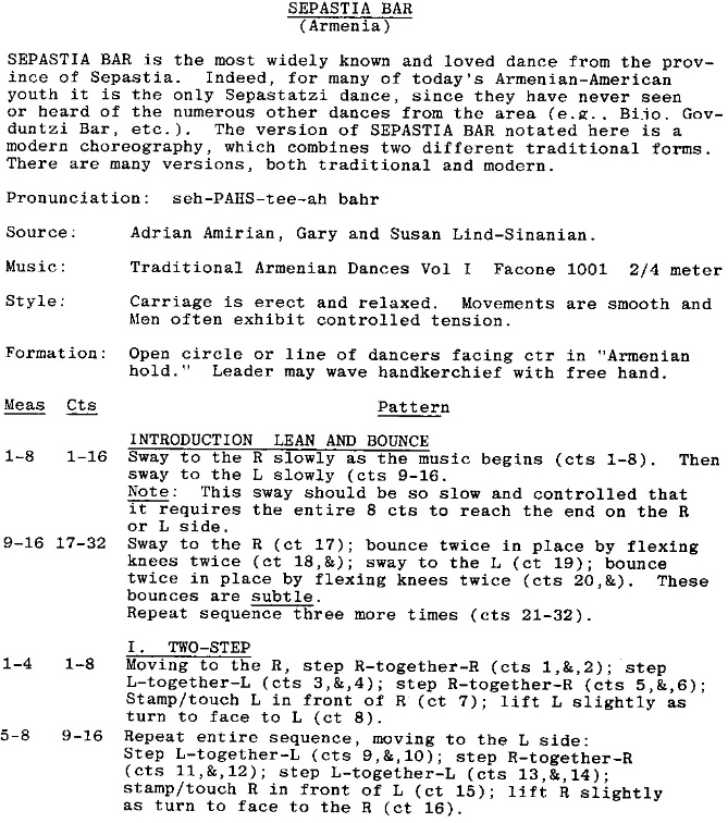 There are many (similar) dances called Sepastia Bar (Bar is an Armenian term for dance). All are danced to the same melody, but some start at different places.