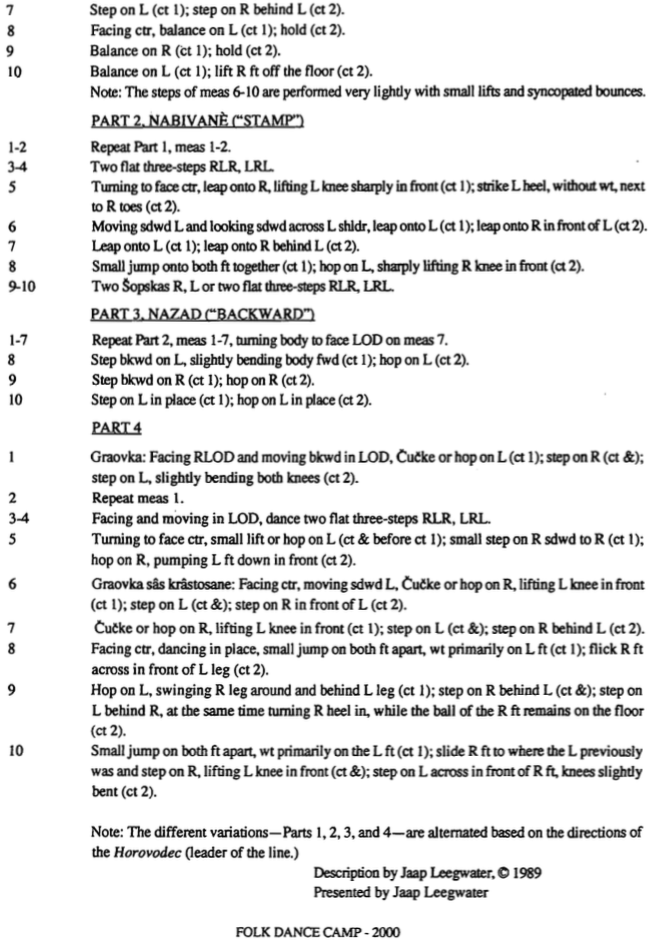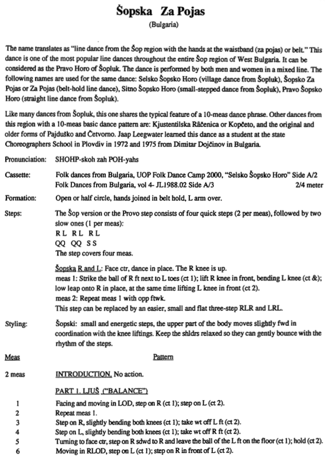 Šopsko horo means “choral dance of the Šop (Shope) region” – a pretty general term, considering the Šop region (the area around Sofia, the capital) has gobs of choral dances. However, Googling Šopsko horo, шопско хоро YouTubes gets pretty consistent results. Almost all the dances have a 10-measure pattern (2/4 time) consisting of two 5-measure sections, each section having the same change-of-weight pattern but with different variations. Since it isn’t quite the same steps to the left as to the right, dance scholars consider these dances asymmetrical. If the steps were the same to both left and right, the dance would be symmetrical, as in the Cigančica/Bugarka group.