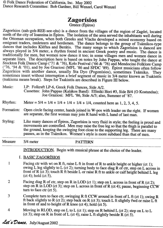 Ron Houston, in his 2007 Folk Dance Problem Solver, details the confusing history of this dance as it was presented in the USA. Early recordings in the USA (1960’s), were labeled as Sagorisios, or dances from Epirus, and were in 4/4 time, (the 5-beat dance was adjusted to fit this rhythm). Someone coined the term Zagoritikos (with a ‘k’) to denote the 5-beat dance, to avoid confusion with the 4-beat Zagorisios in use, when in fact Zagorisios is the proper Greek name for the 5-beat dance. Over time, it seems, most people, especially Greeks, agree that Zagorisios is a 5-beat dance.