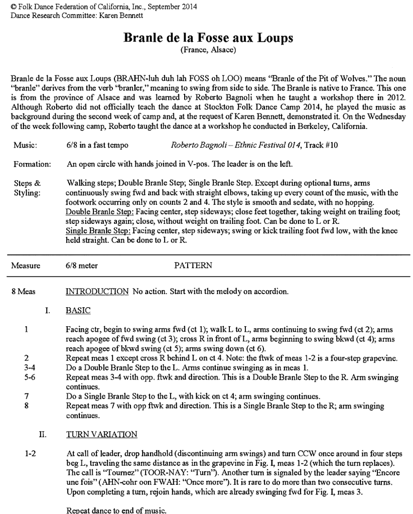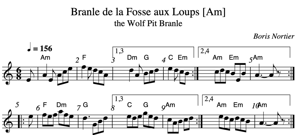 These notes ©2017, Andrew Carnie. Originally taught in the US by Roberto Bagnoli. The notes from France seem to indicate that it was introduced there by Andrée Fischer. We learned the dance from Ann Kyle. The name translates as “Branle from the wolf pit”. Branles are circle dances from the Alsace region of Eastern France and the name refers to the side to side swaying motions typical of this style of dance. https://folkdancemusings.blogspot.com/2017/04/branle-de-la-fosse-aux-loups-france.html
