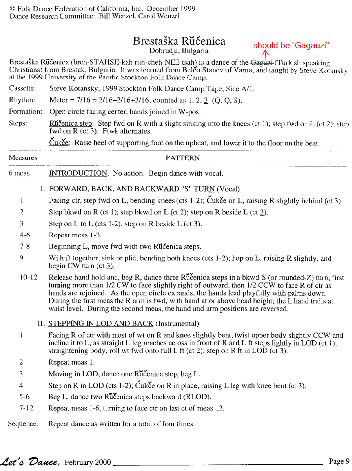 I can find no Bulgarian YouTubes of a dance or a song called Brestaška râčenica. Steve Kotansky and Yves Moreau say they learned the dance from Bulgarian choreographer Belčo Stanev. It’s not clear how much of this dance is ‘folk’ and how much is ‘Stanev’. The fact that the footwork matches the recording exactly is suspicious, considering the recording is a highly arranged orchestrated version of a simple song. It purports to be a dance of the Gagauzi, and it may well be a replication of a Gagauzi footwork pattern, or it may be 2 Gagauzi dances rolled into one arrangement, or it may be a channelling of the choreographer’s understanding of Gagauzi dance preferences or a tribute to Gagauz….For much more on the Gagauz and their dances, click https://folkdancefootnotes.org/culture/ethnicity-history-geography/gagauz-moldova-greece-bulgaria-ukraine/