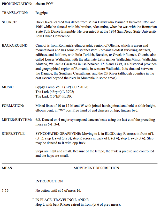 Radbood Koop wrote: Hi Don, as you probably know the music of Mihai David’s dance Cimpoi was included in his album Gypsy Camp Vol.1 GC 5201, I think somewhere late 70s. The music was pirated from the Romanian state record company Electrecord, that released the music in 1969 on the album: The Romanian Folklore Ensemble Ciocîrlia Vol.II, Electrecord ST-EPE 0471 (also catalogue number EPE-0472, and a few years later again with label number ST-EPE 0879), side A, track 7. As you state, the original piece on the Electrecord album is named Joc din cimpoi, translated on the record sleeve as Dance on the bag-pipe, which sounds a bit strange… (probably translated by Romanians at the record company). Neither Joc din cimpoi nor Cimpoi seem to me to be the name of a traditional dance. Although the music of Joc din cimpoi clearly is danceable as a Rustemul, I have the feeling the piece was included on the original LP just as an instrumental to show the musical skills of the famous Marin Chisăr. Like John mentions, Mihai seems to have chosen the name Cimpoi in order to have a unique name not to be confused with Rustemul. In Romanian dance folklore there are traditional dance names that have the word cimpoi in it, like Cimpoiasca (Băcău, Moldova), Cimpoiască (Arad, Banat), Cimpoiaşul (Suceava, Moldova), Cimpoiereasca (Mehedinţi, Oltenia), Cimpoieşu (Botoşani, Moldova), Cimpoiul (Ilfov, Muntenia), but none of these is of the Rustemul type. So the dance known to recreational folk dancers as Cimpoi seems to be a Rustemul (probably choreographed by Mihai on the basis of steps he learned when dancing with the ensemble) with a ‘fantasy’ name referring to the instrument used for the music.