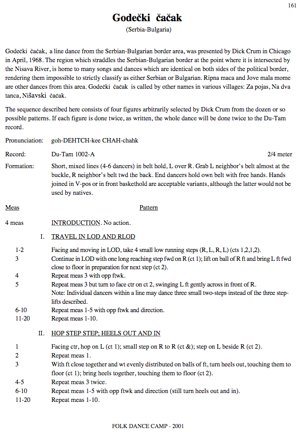 Godečki čačak (goh-DEHTCH-kee CHAH-chahk) is a classic example of what I label a 2nd Generation folk dance – otherwise known as “arranged folklore” (For more on this, click https://folkdancefootnotes.org/begin/how-balkan-folk-dances-are-made-arranged-folklore/). Though the dance is considered Serbian and/or Bulgarian by recreational folk dancers, no one in either Serbia or Bulgaria would call a dance similar to this by this name. Likely no one in Serbia or Bulgaria has ever danced this particular choreography, nor would they recognize the American-made (1967) recording that is the universally-used musical accompaniment. According to the ©2015 Folk Dance Problem Solver, the dance’s creator, Dick Crum, “choreographed Godečki Čačak as part of Serbian Medley #6, ‘Nišava Valley Dance Suite’ for the Duquesne University Tamburitzans (of Pittsburgh, PA) for the 1964-1965 performance year. Possibly to appease his largely Serbo-Croatian audiences, he termed those dances ‘Serbian Folk Dances,’ and he may have felt that a Serbian dance deserved a Serbian dance name, such as ‘čačak.”