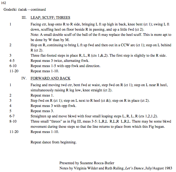 As quoted in the ©2015 Problem Solver “Crum explained the name ‘Na dva tanca’ as follows: In some villages Godečki čačak is called Na tva tanca (“with two leaders”). In these villages the men on both ends of the line must be excellent dancers. In the course of the dance each leader will take turns swinging his half of the line inward toward the other half, then out again. The steps used for this forward movement are those of figure IV; the ‘inactive’ half of the line does one of the more stationary figures, such as II or III. The co-ordination of these steps or movements, however, is very tricky, and depends on quick, almost imperceptible signals as well as years of practicing together! (Folk Arts Workshop, YWCA of Greater Pittsburgh, February, 1968).”