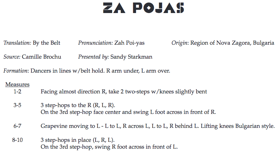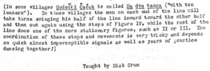 The ©2015 Folk Dance Problem Solver states “Inferring from the EFC listserve messages, Crum apparently derived the motifs and musical score for Za pojas-Godečki čačak from [the book or periodical] ‘Godečki narodni hora’ in Tancova Samodejnost 3:2 (Sofia, Bulgaria, 1959).” In other words, although Crum may have seen versions of Za Pojas live, he got his steps for his Godečki čačak out of a book. The Problem Solver says “Crum frequently mentioned ‘a dozen or so variants”, so the 4-part dance created by Crum was a distillation of many different steps, likely collected for the publication in varying locations at different times.