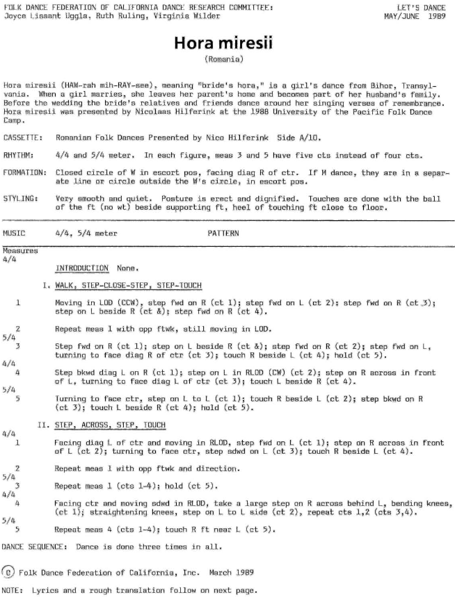 For RFD groups, a Hora Miresii was presented at Stockton in 1988 by Nicolaas Hilferink, which has become ‘standard’ in the recreational dance community. However, I recently got an email from Judy Stafford, saying “My understanding is that Teodor [Vasilescu] collected the dance in Romania (which doesn’t mean it’s not 2G), Niko learned it from Teodor, modified it, and then spread his version.” Here is a video of Teodor Vasilescu teaching his Hora Miresii.