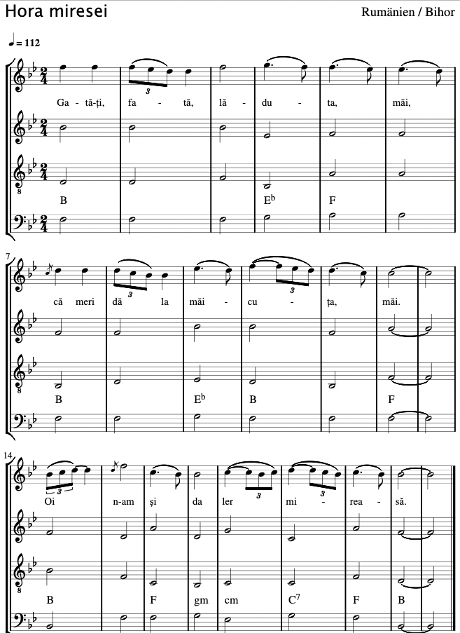 Because I could not find a YouTube example of Vasilescu/Hilferink’s Hora Miresei being danced in Romania, and because I have trouble believing the maids of honor would have the space to perform Vasilescu/Hilferink’s Hora Miresei in the confines of a peasant bride’s room while carefully dressing her, I have deduced this dance follows the “tradition” of creating a choreography to honor a beautiful song.
