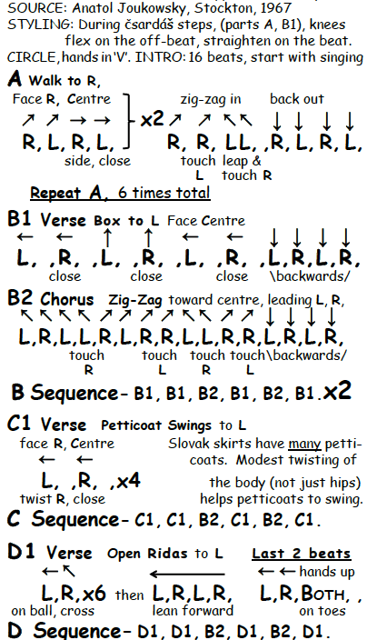 The source for Horehronsky Čardáš, Anatol Joukowsky, was one of the early “authorities” in the folk dance movement. His book The Teaching of Ethnic Dance, was based on research trips he made in the 1920’s & 1930’s throughout Eastern Europe, when most ‘peasant’ dances were dying out. Although his book claimed his dances were observed in village settings, information on the sources of individual dances is lacking. Joukowsky was trained in classical ballet, became a principal dancer and most of his life he was a choreographer for ballet companies in Europe and California. Dances he ‘presented’ have a theatrical, even balletic feel, and it’s not much of a stretch to imagine he ‘improved’ what were originally folk steps.