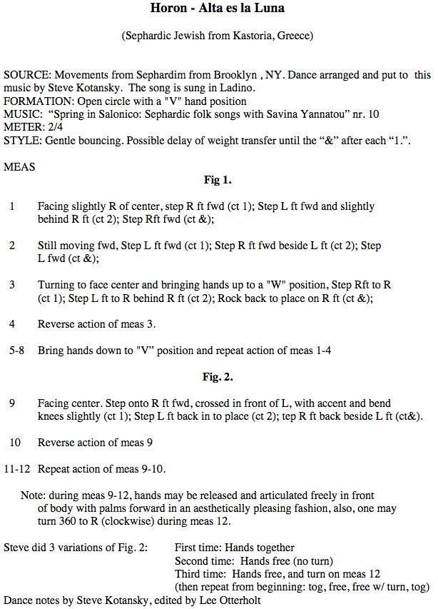 John Uhlemann wrote: “The first person to teach this was Steve Kotansky, who saw these steps done at a Sephardic Jewish party. At that time he saw the steps done to several pieces of music, so Steve picked this tune because it was pleasant and fit the style he had heard. Most of the other people in the room just did the first part, obviously a syrto, but Steve’s eye was drawn to 3-4 older women who did a sort of mix and match depending on the music. Steve said it was from those steps that he constructed this dance. This was presented at Balkan camp, and he did not use the term “horon” at that time. About 2 years later I heard that other teachers had started teaching it with stylistic changes. (For example, the second part as a “cross, back, step” as opposed to the “cross, side step” that Steve taught.). Could it be that the other teachers did their own research? Or were they re-presenting the dance Steve taught, in light of other experiences they may have had with the style.