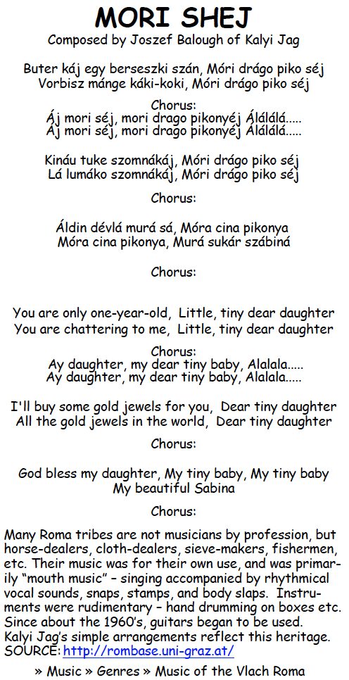 MORI SHEJ (MOH-ree Shay) “(My) Daughter” MORI SHEJ is a song recorded in 1995 for the album O SUNO by the Hungarian Roma group Kalyi Jag. (Hungaroton 18211). They usually record traditional material, but member Joszef Balough wrote this lullaby for his daughter, Sabina.