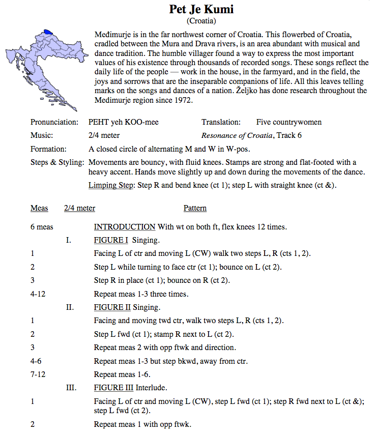 John Uhlemann wrote: Lado made several versions of its best repertoire. In his liner notes for the teaching CD of this dance, Željko Jergan said the original to the music he used was arranged by Božo (Božedar) Potočnik. The music from Međimurje has a Hungarian sound for the reasons you mentioned. Jeljko said that local songs and dances were suppressed by the Hungarians and, while some of the songs were remembered, the dances were all lost. After WWII, when the area became part of the Croatian republic of the new Yugoslavia, dance instructors came in and created dances for the region to some to the surviving songs. Many of them stuck and became part of village repertoire; others survived only in performing groups. Raca Plava is an example of this. I am not sure which category Pet je kumi is in, or if it is a newer creation.