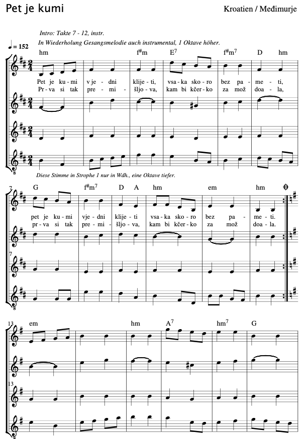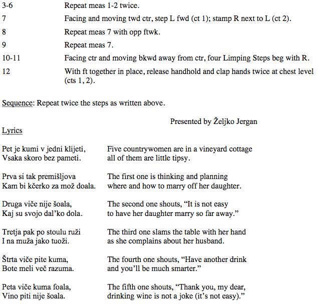 ///Pet je kumi v jedni kleti/// saka skoro bez pameti. Prva veli pijte kuma bute mali već razuma ???????? Prva veli pijte kuma bute mali već razuma Druga ????????? ?????zdihava v puni pehar nalukavla Instrumental interlude Trejta pak po stolu ruži i na muža jako tuži ?????????? //??????????// Četrta ?????????????? //???????????// Instrumental interlude Peta si pak premišlava jel bi čerku zamuž dala // il bi sebi dečka zela il bi njemu čerku dala //
