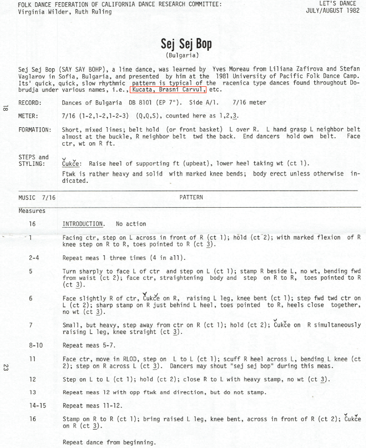 Our only North American source for this dance is Yves Moreau, who introduced it at Stockton in 1981. Googling YouTubes of Sej Sej Bop (or bob) results in only one video from California and none from Bulgaria.