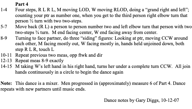 2ndG dances are specific – usually pegged to a specific song with a specific arrangement. The choreography often matches a particular recording and will only work with that recording. Everyone in the line does the same step at the same time. The dance may be a combination of the best bits from several similar dances. It may be the creation of a choreographer who liked a recording and wanted to have “authentic” footwork attached to it.