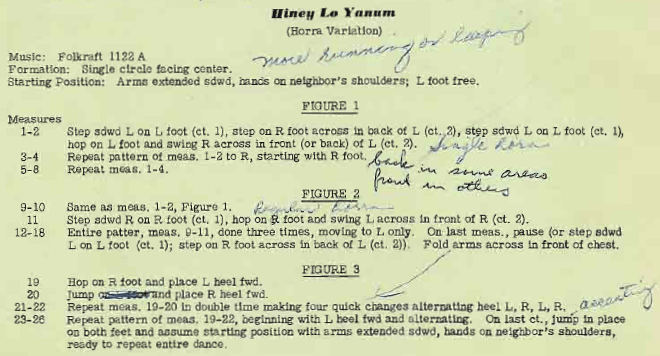 In 1953, Miriam Lidster taught Hiney Lo Yanum at Stockton. She added the subtitle (Horra Variation), and changed the steps slightly.