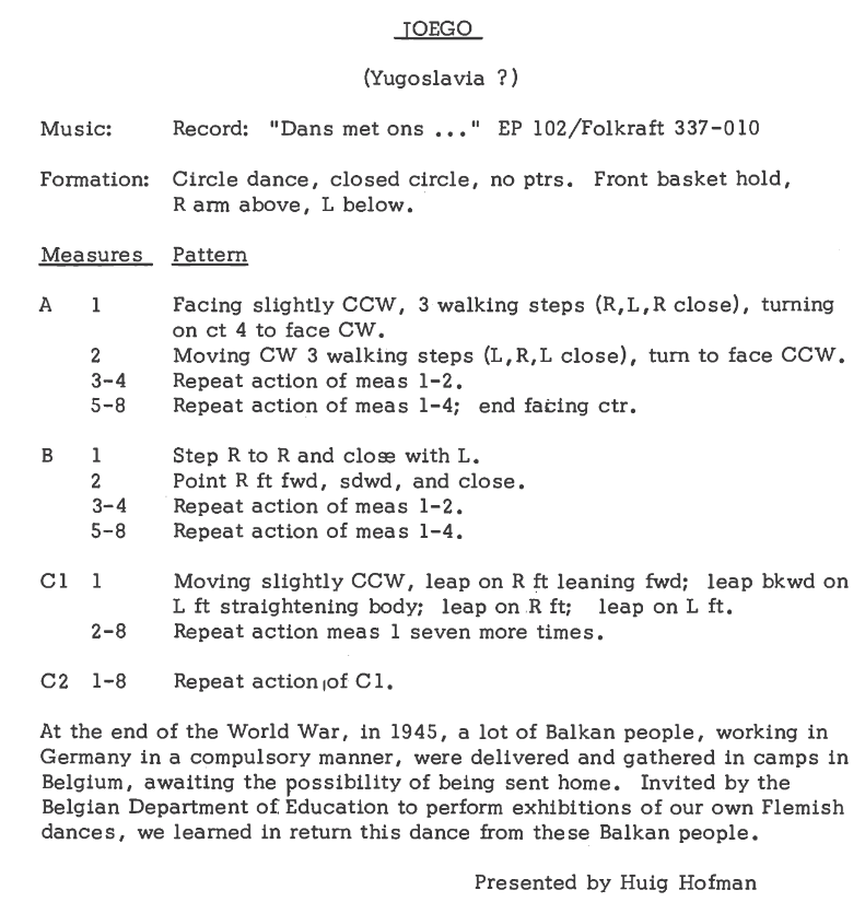 From the Folk Dance Problem Solver, ©2002 by Ron Houston: “In late 1945, Hiug (pronoiunced HOYkh) Hofman (a Flemish Belgian, hence, the single “f”) and several of his Flemish dance group, including Jan Wouters, were invited to a displaced persons internment camp in Mechelen, about 24km south of Antwerp, to demonstrate folk dances and to lead recreational dancing. Hofman, ever the avid researcher and collector, asked the internees to share one or two of their dances. Some of the Yugoslavs there showed the steps of a dance which Hofman labeled Joego (Flemish/Dutch spelling of the Slavic prefix meaning ‘south’ or ‘southern’). According to famous folk dance researcher and teacher Ricky Holden, who interviewed Wouters again in 2002, the Yugoslavs knew quite well that the dance was Jewish – they never claimed it was Slavic.”