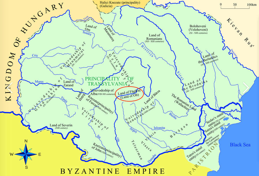 Wikipedia: “The first written document mentioning Romanians in Transylvania referred to Vlach lands (“Terra Blacorum”) in the Făgăraș Region in 1222….After the Tatar invasion in 1241–1242, Saxons settled in the area. In 1369, Louis I of Hungary gave the Royal Estates of Făgăraș to his vassal, Vladislav I of Wallachia….Therefore, the region became the feudal property of the princes of Wallachia, but remained within the Kingdom of Hungary. The territory remained in the possession of Wallachian princes until 1464.”