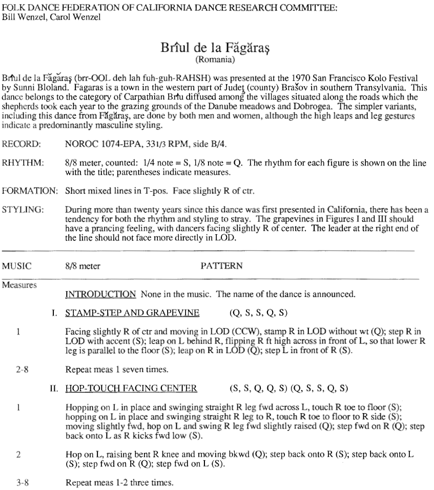 John Uhlemann wrote: I have seen the folklorist version of this in Romania and also had a short class in it here from a visiting Romanian group. They all agreed that what they saw American folk dancers do was not what was seen in Romania. The version I learned in the line in Romania followed the “chorus -> variation” pattern in most of your examples, but it was not an aerobic dance at all, the variations did not move from place and were not “virtuosic”. In fact , the in-place variations were all structurally the same; this means that you could do any of them you wanted, and not disturb the person next to you who might be doing something different. This is one of the hallmarks of a traditional dance. The music in all cases was the syncopated version you have. The regular 2/4 version danced to by recreational groups is not a Briul melody at all, the the result of Sunni Bloland being sent the wrong music (she told me so). She was sent a tape of a dance called “Hațegana de la Mojna”, a couple dance from the mostly German village of Meschen near Sibiu. (I had an opportunity to visit that village , which has a large fortified German church in the middle, in the 1970s.) I have the original recording of that tune on the Romanian label accidentally sent to Sunni. Sunni tried to correct the error by re-teaching the dance to the correct music, available on the Dutch folkdancer Nevofon label, but people had too much trouble with the rhythm, so I have never been to a group that used it (except ours, when the programmer was feeling sadistic – it goes through 3 times). The dance, of course, is not related to other Transylvanian dances, but evolved, as Sunni’s notes say in your article, from southern Romanian styles. I’m glad you posted these variants. The dance is done in a curved line/broken circle. All the other videos have the dance altered to keep the line facing the audience.