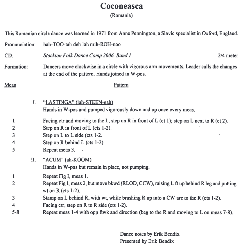 Radboud Koop on Coconeasca: Theodor Vasilescu did a dance with this name in his program in 1990. His version is from the village of Pătulele, jud. Mehedinţi, Oltenia. As you know Anca Giurchescu mentions Coconeasca as an example in her discussion on symmetry in dances, in this case directional symmetry. Theodor’s Coconeasca is exactly such a directional symmetric dance, like a Hora în două părţi. It has two figures and a basket-hold position. I only have a notation in Romanian Kinetographic notation (a system developed by Sever Tita and Theodor Vasilescu, different from, but based on, the Romanian Rapid Dance Notation system used by Anca). The music used by Theodor for his Coconeasca is this one: https://www.youtube.com/watch?v=Gq40MYlGag8 [in the music section, above DB]. In the Dictionary of Romanian Folk Dances by G.T.Niculescu-Varone & E.Costache-Varone (1979) only one Coconeasca is mentioned, the one from Pătulele, Mehedinţi (same as Theodor).
