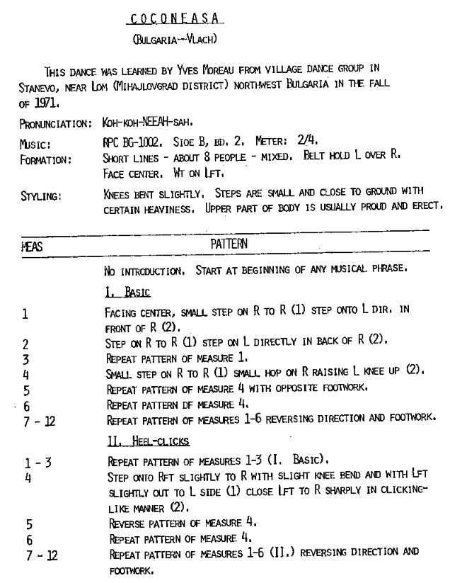 Yves Moreau taught a very different 3-part Coconeasca, using brass band music. Danced by Vlachs just over the Danube in Bulgaria. Notes below are from the 1976 Kolo Festival.