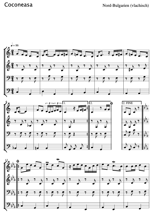 The dance Coconeasca appears to have no particular songs or melodies associated with it. Every dance and instructor below uses different music, none of which are the melody below. However, all the music I’ve heard is in 2/4 time with a moderate tempo.