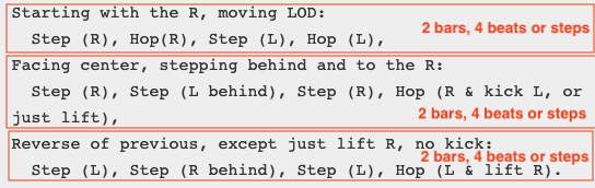 Fortunately for us, Dunavsko horo has steps that are all the same length – one beat each, or 2 steps to a bar. A hop (or a kick) counts as a step, and is also one beat long, so the first bar consists of a step and a hop.