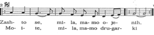 At the beginning of the music, you’ll see these symbols and numbers. The only thing you need to know now is the 2 over 4. The top “2” says how many beats are in a measure, or ‘bar’ (the number of beats between a pair of bars, in this case 2). The bottom “4” says what constitutes a beat – in this case a quarter note, which looks like the notes above “Zash-to”. So 2 beats to a bar, a quarter note gets one beat. Each of these measures, or bars, adds up to 2 beats, even though they sometimes have many more (or less) notes. That means some notes last longer or slower than others, but no matter how many notes are in a bar, each bar contains a total of 2 beats.
