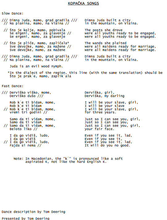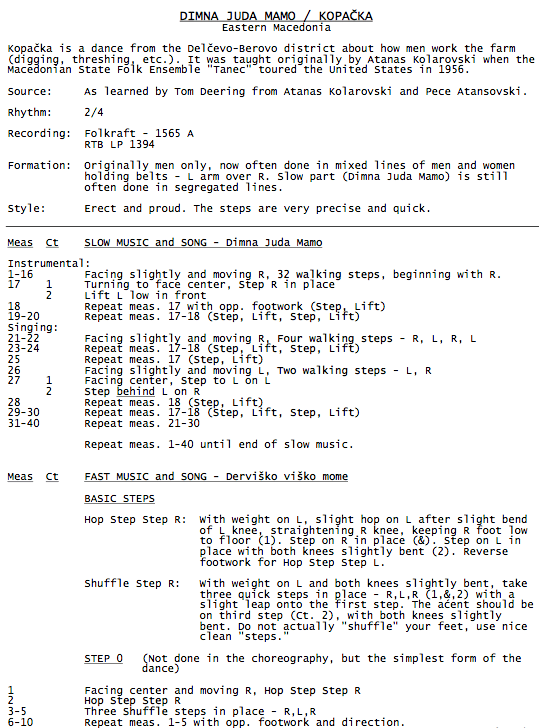 In their book “Ensemble Tanec – Dances of Macedonia” (Skopje 1995), Elsie Ivančić-Dunin and Stanimir Višinski explain the origins of dances in the Tanec Ensemble repertoire. On page 180, they state that Kopačka is from the Delčevo area and was taught by Stojče Zahariev and Nikola Arsov, village dancers from that area, adding that in the early performances of Tanec, the medley: Dimna Juda and Kopačka (using the song Dereviško, viško mome) was done to the accompaniement of a ćemane (three stringed-fiddle) and later to gajda and tâpan.