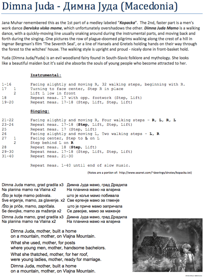 In the 1980s Carol Hirsh, our previous teacher in Petaluma, taught Dimna Juda as its own unique dance, rather than simply as the slow first half of Tanec’s “Kopachka” medley arrangement. We’ve kept it going occasionally since then – mostly around Halloween. We dance it much like Jim Gold does in the video you included. But instead of the “V” arm pattern in Gold’s video, we use a front-basket-hold – otherwise our styling and Jim Gold’s is practically the same. The front-basket-hold adds tension to the story’s inevitable and inescapable end, as the dancers are pulled along toward Dimna Juda’s farm.