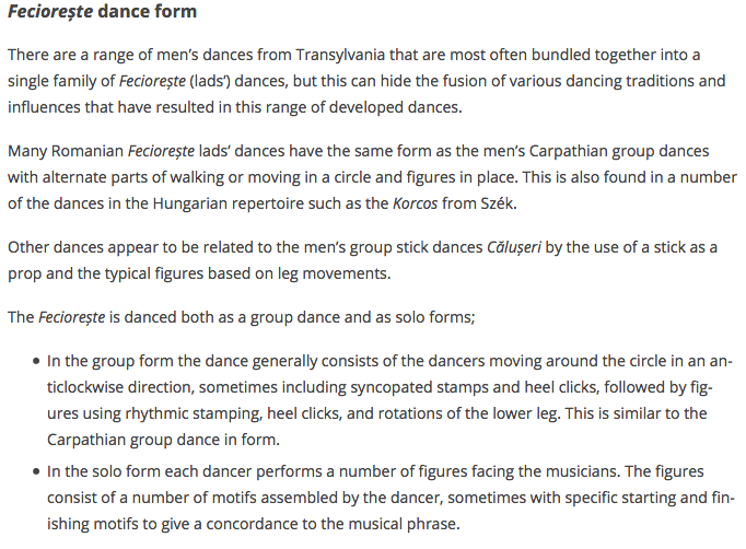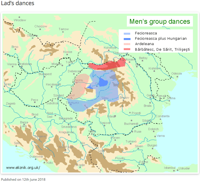 Excerpts (below) from the article “Transylvanian Lad’s Dances” on the Eliznik website. For full text, click here: https://eliznik.org.uk/traditions-in-romania/traditional-dance/ceata-mens-group-dances/fecioreste-lads-dances/
