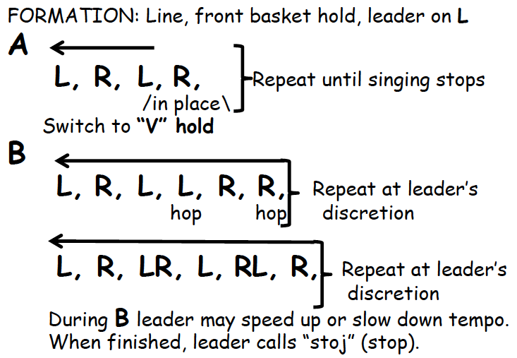In his 1997 interview, Dick had this to say about the slow grapevine “In the recreational folk dance movement, Ličko kolo took off and acquired a life of its own. The steps themselves have changed (the natural folk process) over the years, and a purely U.S. variation of slow step has developed: a grapevine to the left: step left, step right in front of left, step left, step right foot in back of left. This is a change from the traditional structure in which the last step by the right foot never crossed in back of the left; rather, it either stepped in place, very slightly to the right or straight or diagonally/right back from the center with a slight pause.“