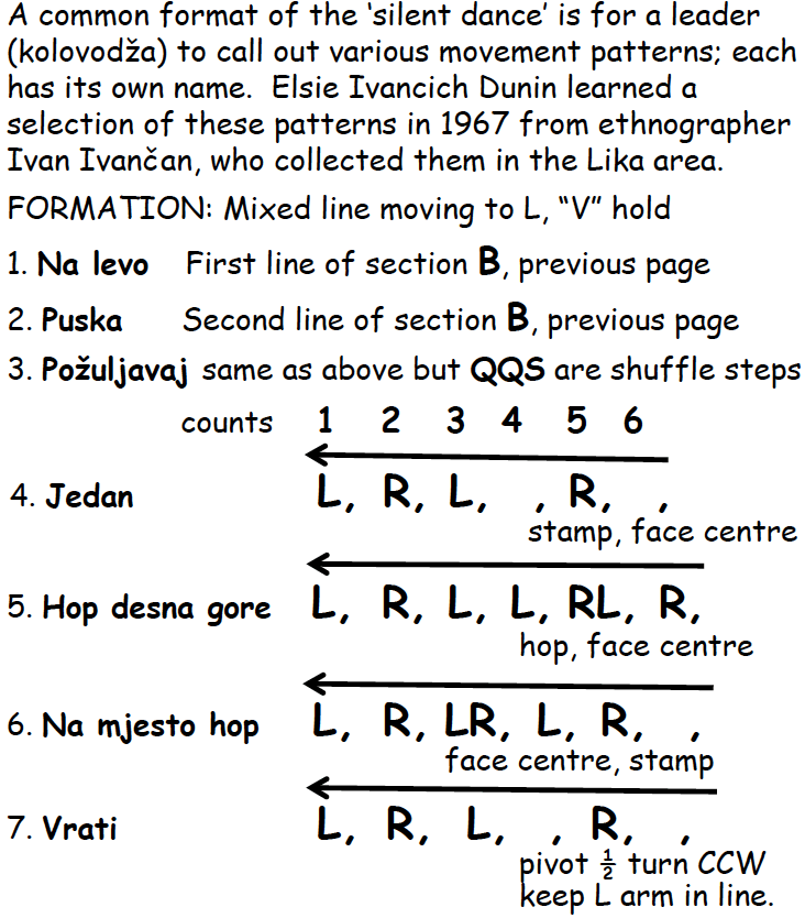 Similar to Bosnia and Montenegro, the Croatian two-part Nijemo kolo (Ličko kolo) has a more energetic second section, sometimes breaking into couples, where, like the Montenegran Crmnički Oro, the man ‘tests’ the woman. Dick Crum again: “The dance is very old, and at one time (pre World War II) had many variants all over Lika. According to old-timers, the main function of the dance was to demonstrate and test the strength and stamina of the young people. In particular, the suitability of marriageable young women was judged by their ability to endure the strenuous movements of the dance’s fast part which, as done by natives, can be very strenuous. The historic formation was a circle of dancers, alternating mixed man-woman-man-woman, the couples in each case being sweethearts or engaged pairs. The dance was always done without musical accompaniment – the first part accompanied by dancers’ singing, the second part of comparative silence, the footfalls of the dancers being the only ‘audio’ element besides the shouts and commands of the leader. In an older form of Ličko, the leader played the role of ‘dance director’, shouting out commands for all the dancers to perform certain standard step patterns; failure to perform them up to snuff meant possible ejection from the circle!” The dance started out with an ambling, almost casual walking step moving left (clockwise), three steps left and one step more or less in place, to the singing. When the song finished, dancers ‘shifted gears’ into the fast, high-energy Part II. After World War II the old versions of the dance had pretty well died out, and a simpler form prevailed. in some places called either Ličko kolo or by a new name Djikac (JEE-kahtz, ‘jumping’).“