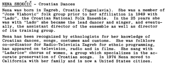 In 1957 Dick Crum assembled a song popular in Lika; Pjevaj Mi Pjevaj, and a few typical Lika region moves, labeled it Ličko Kolo, and taught it to recreational folk dancers. In the same April 1997 issue of Folk Dance Scene excerpted above, Dick said his assembly was “pretty much as I had witnessed in Stajnice and also as it was done in Upper Michigan by descendants of immigrants from Lika, whose parents had come there to work copper mines… I thought it would be fun to teach people the kind of dance where you don’t need a record.” Although that song Pjevaj Mi Pjevaj is still popular in Croatia today, I could find no instances of its use accompanying a Nijemo kolo. Lead singer is Dobrivoje Pavlica.