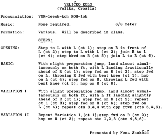 In 1987, Nena Shokčič taught Vrličko kolo at Stockton. Below are her notes (and corrections plus details in pink).