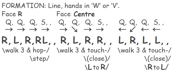 Note: Some Bulgarians and some Bulgarian expats call the dance Gankino. Though Gankino is usually defined as having an 11/8 rhythm [Q,Q,S,Q,Q,] in fact the footwork of the basic step can be done to a 9/8 rhythm just as easily. Put another way, Devetorka/Samokovsko horo could be danced just as easily in 11/8. The weight changes, number and direction of steps, are the same. There are slight, almost miniscule differences in the timing of the steps, but I defy you to feel the difference when tipsy at a party, which is how most Bulgarians dance. One dances the footwork patterns one knows to the rhythm the musicians are playing.