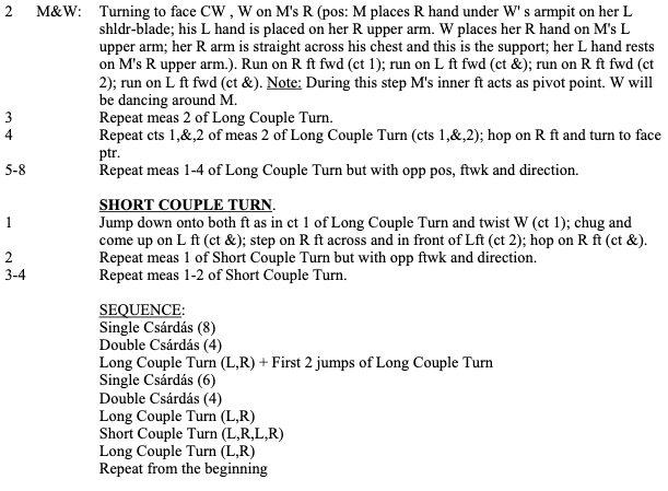 This is a Living dance, accompanied by live music. Musicians adapt to the demands of the dancers. Dancers do not necessarily learn from the same source. Tempos vary, and in some cases a phrase may be repeated to lengthen a particular section. The direction and type of step in Melody 2 also varies. There are several YouTubes shown, which combined are the basis for this description.