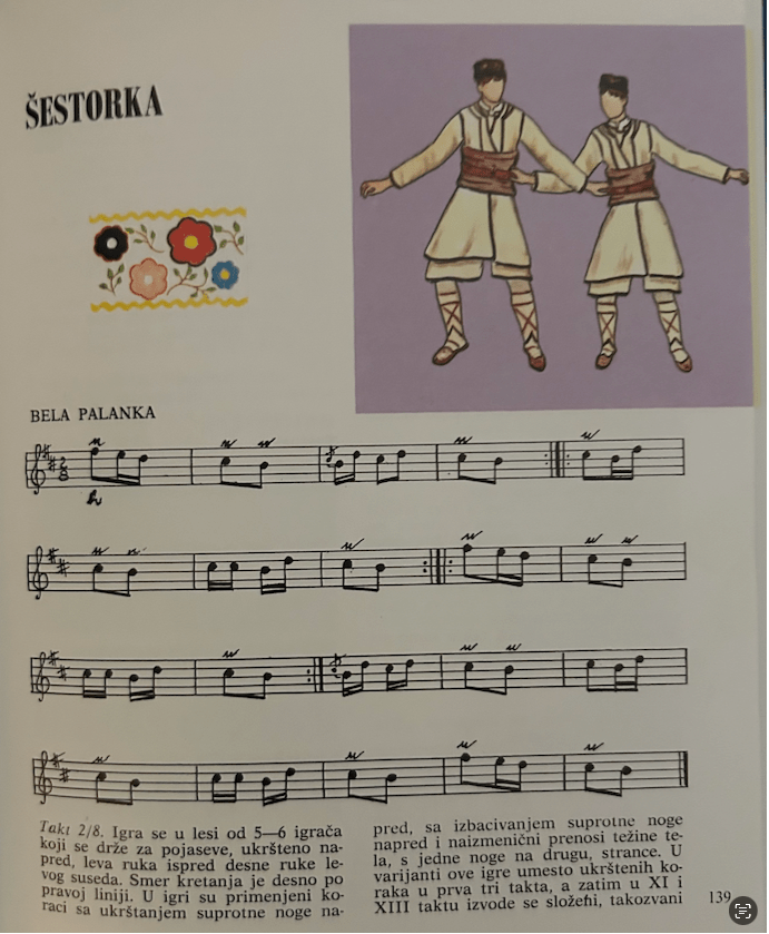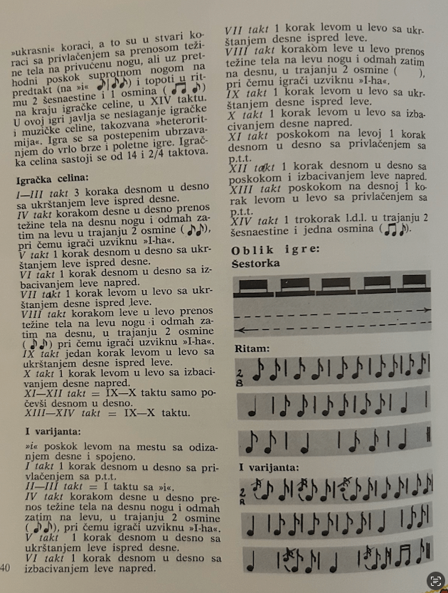 The second source is a collection of folk dances (book and music records) also issued in Yugoslavia: Prof. Branka Koturović and Prof. Aleksandar Marinković: Narodne igre Jugoslavije – metodika, tehnika, ritam, Beograd 1973. Šetorka is included in the chapter on dances from East-Serbia, and is mentioned as a dance from Bela Palanka. See the copy of the relevant pages [below, DB]. A rough translation of the introductory notes to Šestorka is: “It is danced in a group of 5-6 dancers holding their belts, arms crossed in front, left arm in front of the right arm of the left neighbor. The direction of movement is to the right in a straight line. The dance uses crossing steps with the opposite leg in front, throwing the opposite leg forward and alternately transferring the weight of the body, from one leg to the other. In the variant of the dance, instead of crossing steps in the first three measures, and then in the XI and XIII measures, complex, so-called “decorative” steps are performed, which are in fact closing steps with the transfer of body weight to the closing leg, but with a previous hop with the opposite leg to the pre-beat and stomp, in the rhythm of 2 sixteenths and 1 eighth at the end of the musical unit, and in bar XIV. In this dance, there is a discrepancy between the dance and musical phrases, the so-called “heterorhythm”. It is danced with a gradual acceleration to a very fast and lively dance. The dance figure consists of 14 2/4 measures.”