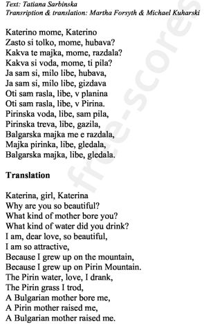 Source: https://lyricstranslate.com Katerino mome, Katerino! Catherine, young lass, Catherine, Katerino mome, krotkoj agne! Catherine, young lass, you meek lamb! Zašto si tolkoz mome hubava? Why are you, young lass, so beautiful? Zašto si tolkoz mome gizdava? Why are you, young lass, so well dressed? Kakva si voda mome, si pila? What kind of a water, young lass, you've drunk? Kakva si treva mome, gazila? What kind of a grass, young lass, you've walked on? Kakva te e majka mome raždala? What kind of a mother, young lass, gave birth to you? Kakva te e majka mome gledala? What kind of a mother, young lass, has raised you? Ja sǎm si milo libe hubava. I'm, my love, beautiful, Ja sǎm si milo libe gizdava. I'm, my love, so well dressed, Oti sǎm rastla libe v planina. Because I grew up in the mountain Oti sǎm rastla libe v Pirina. Because I grew up in the Pirin. Pirinska voda, libe, sǎm pila, I've drunk, my love, water from Pirin planinska treva, libe gazila, I've walked on, my love, a grass of Pirin Majka pirinka me e gledala, A mother from Pirin has raised me, bǔlgarska majka me e raždala. A Bulgarian mother gave birth to me. Bǔlgarska majka me e raždala! A Bulgarian mother gave birth to me! https://lyricstranslate.com